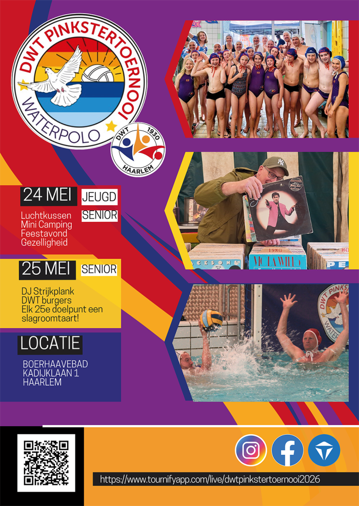 Ook in 2026 organiseren wij natuurlijk weer het DWT Pinkstertoernooi, dit jaar op zondag 24 en maandag 25 mei. Het toernooi wordt gespeeld in het Boerhaavebad in Haarlem en ook dit jaar is er weer plaats voor jeugd-, heren- en damesteams van alle niveaus!
